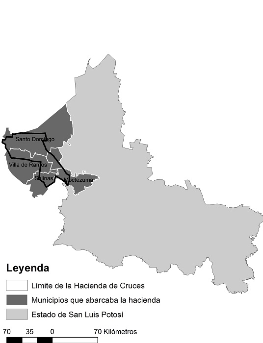 A mediados del siglo XIX, los territorios conocidos como el altiplano potosino estaban ocupados por un conjunto de haciendas de grandes dimensiones; entre ellas destacaba el gran latifundio de Cruces, que en el último tercio del siglo tenía una extensión cercana a 380 mil hectáreas. La hacienda era propiedad de la familia Hernández Soto -que estaba muy vinculada con la oligarquía estatal (Franco-Maass y Gutiérrez-Rivas, 2013)- y se localizaba en la porción occidental del estado de San Luis Potosí (México) abarcando parte de los municipios de Santo Domingo, Villa de Ramos, Salinas y Moctezuma (véase la figura 1).