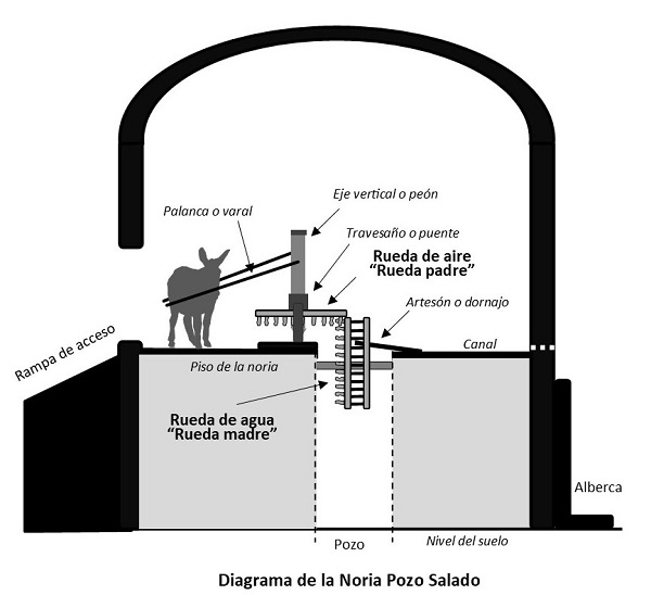 Las norias asociadas a tanques o bordos en la hacienda de Cruces, y en particular la noria de Pozo Salado, eran norias de sangre movidas por lo bajo, con dimensiones y cualidades similares a las descritas de una noria de las Salinas de Imón (Cruz, 1989) y a las reportadas por Trallero Sanz et al. (2003) respecto de una noria de las Salinas de Atienza. Las norias por lo bajo, también denominadas hispánicas, eran ampliamente utilizadas en la península ibérica, y constaban de un par de ruedas dispuestas en dirección perpendicular y engranadas de tal modo que la de giro horizontal y eje vertical arrastraba en su movimiento a la de giro vertical y eje horizontal. Se llaman “por lo bajo” porque la maquinaria estaba dispuesta por debajo del nivel del atalaje y tiro del animal. En general, presentaban un mejor funcionamiento y mayor rendimiento mecánico y económico. Por ejemplo, la noria reportada por Cruz (1989) tenía una capacidad de extracción y elevación de agua de 20 a 25 metros cúbicos por hora, con un 70 por ciento de rendimiento mecánico.