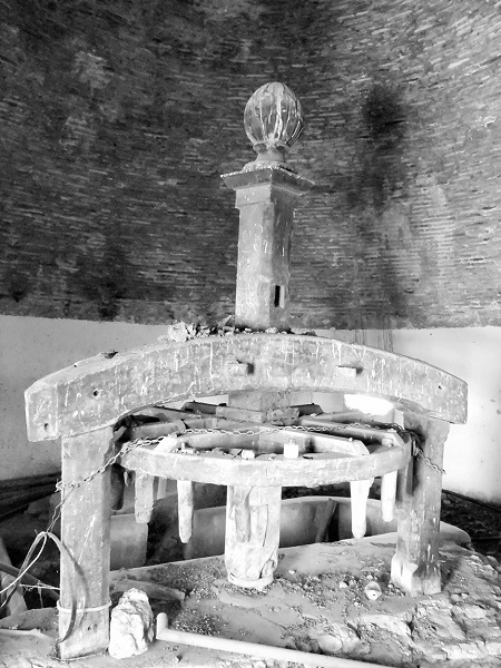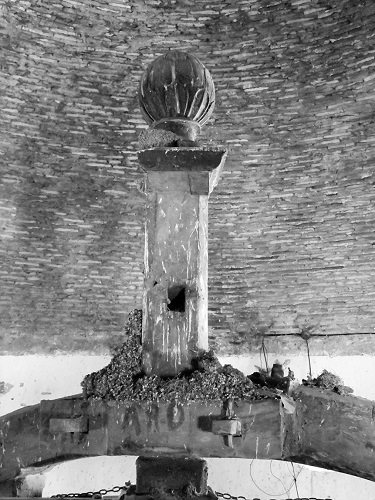 Para permitir su rotación, el eje de giro llevaba en su extremo inferior, encajado en el piso, un pivote reforzado con una abrazadera metálica. El eje estaba sujeto a un durmiente o travesaño horizontal que descansaba sobre dos vigas de madera empotradas en el suelo. Dicho travesaño tenía dos huecos de sección rectangular, vaciados en la madera a ambos lados del eje, en los que encajaban unos pivotes de madera para sujetar el trozo de viga que hacía las veces de abrazadera del eje, misma abrazadera que impedía su traslación o desplome, pero que permitía su rotación (véase la fotografía 9). De acuerdo con Trallero Sanz et al. (2003), en las norias, al eje de giro vertical cuando es corto y su sujeción depende en buena medida de esa viga travesaño se le conoce como “peón” y al madero que sujeta al eje por encima de la corona se le llama “puente”.