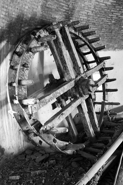 La rueda de eje horizontal, denominada rueda elevadora o de agua, se componía de dos coronas circulares de madera de iguales dimensiones que la rueda de aire (2.1 metros de diámetro exterior), y con una separación entre ambas de unos 35 centímetros (véase la fotografía 10). La corona más cercana a la rueda de aire se encontraba rigidizada mediante un sistema similar de brazos de madera ensamblados en cruz que ceñían apretadamente el árbol o eje de rotación horizontal, y que, muy posiblemente,6 consistía en una viga de madera de base cuadrangular de unos 25 centímetros de lado, la cual giraba gracias a pivotes cilíndricos empotrados en los muros laterales del pozo a la altura de la boca. La corona exterior estaba exenta de brazos de madera porque estos impedirían la colocación de un artesón o dornajo, de planta rectangular, por encima del árbol o eje de giro horizontal, para recibir el agua vertida y guiarla por un canal hacia el exterior del edificio por un orificio que conectaba con la alberca directamente.
