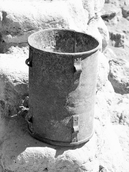 En la primera mitad del siglo XX, cuando aún la maquinaria estaba en uso, se utilizaban cangilones cilíndricos de hierro, con una altura de 21 centímetros, un diámetro de 14 centímetros y un grosor aproximado de 0.5 centímetros (véase la fotografía 11). Dichos cangilones tenían una capacidad de 3.5 litros, y contaban con orejas de metal para facilitar su atado a la doble maroma.