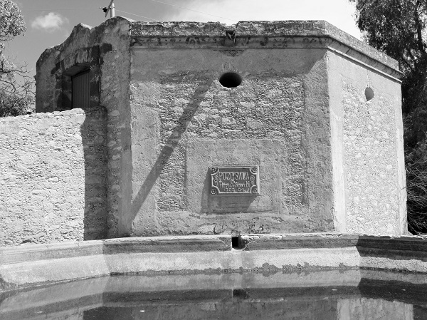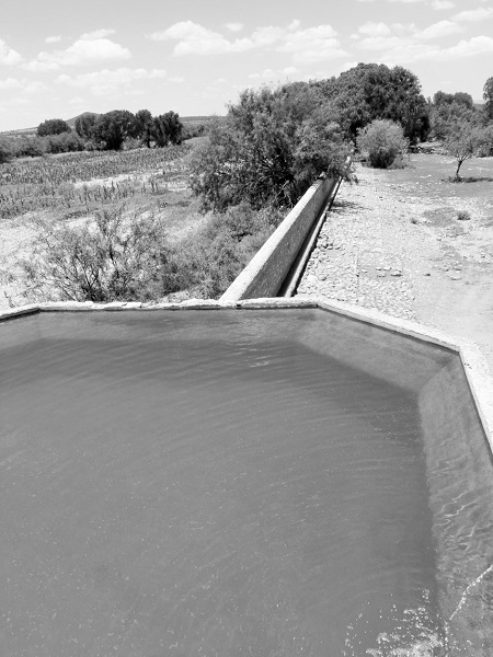 Pozo Salado cuenta con una alberca o pila de gruesos muros de mampostería y base octagonal, adosada al edificio de la noria (véase la fotografía 14). Tiene una capacidad de almacenamiento de 72 metros cúbicos y, de acuerdo con otros estudios sobre norias similares, podía llenarse en unas siete horas y media.9 Este volumen de agua podría dar abrevadero a un máximo estimado de 11 464 ovejas y 740 cabezas de ganado mayor.10