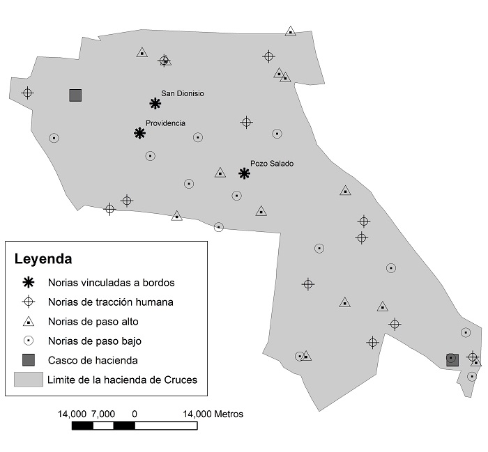 Comúnmente, las norias se encuentran separadas a una distancia promedio de 5 060 metros, lo cual permitía el arreo del ganado entre ellas. De acuerdo con su distribución espacial, las norias para ganado mayor se encontraban fuertemente asociadas al casco de la hacienda de Cruces y a algunas estancias ganaderas importantes, tal es el caso de Santa María, El Toro y El Salado. Las norias con abrevadero para ganado mayor y menor estaban asociadas con algunas estancias como La Hedionda, La Herradura, Pozo Salado y Providencia. Las norias destinadas exclusivamente al abrevadero de ganado menor estaban más vinculadas con los ranchos,4 como Rancho Guadalupe, El Ranchito, Rancho San Antonio o Rancho Los Hernández.