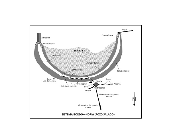 De las 39 norias que tenía la hacienda en 1890, siete aprovechaban el agua almacenada en tanques construidos de forma perpendicular a las ramblas (Pozo Salado, Providencia, San Dionisio, El Toril, La Candelaria y San Antonio del Mezquite). En la mayoría de los casos, la recarga del pozo ocurría simplemente por la filtración de las aguas subálveas. Tres de las citadas norias (Pozo Salado, Providencia y San Dionisio) (véase la figura 2) tenían galerías de drenaje (acueductos subterráneos) que conectaban el tanque con el pozo de la noria. Esto les permitía captar esas aguas subálveas y conducirlas para favorecer aún más la recarga y la recuperación del nivel piezométrico del pozo. Una posible explicación de la existencia de estas galerías es que el pozo no se encontraba en la parte media del bordo, lo que garantizaría un mayor aporte de agua, sobre todo en época de estiaje.