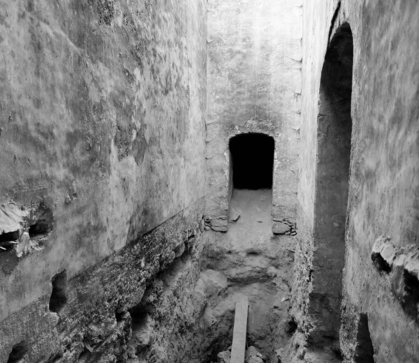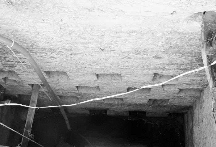 Las galerías de drenaje no son privativas de las norias asociadas a tanques. Se ha identificado su existencia en otras norias ubicadas en lo que fue la hacienda. Tal es el caso de Jesús María, donde hay dos galerías, una de las cuales, de acuerdo con los encargados de la noria, tiene una longitud superior a 100 metros (véase la fotografía 4). Si bien se tienen reportes orales y evidencias muy claras de la existencia de la galería de drenaje de Pozo Salado, no fue posible documentar con precisión sus características estructurales. Hacia el último tercio del siglo XX, se introdujo maquinaria para realizar un levantamiento de la cortina del bordo, lo que significó que algunos elementos construidos en último tercio del siglo XIX quedaran dañados o enterrados, entre ellos la conexión de los pozos de ventilación (lumbreras), la galería y la mina de acceso al pozo principal; también se destruyó una de las cuatro lumbreras.