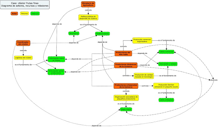 El pensamiento complejo nos condujo a indagar en los modelos mentales de los actores sociales para comprender cómo cada uno de ellos problematiza el proceso de formación del clúster del cual eran partícipes. Este análisis permitió elaborar un diagrama de actores, recursos y relaciones (véase la figura 1). Se identificaron en total cinco actores clave: el Ministerio de Agricultura, el coordinador del clúster, los productores del Alto Valle de Neuquén, los productores dinámicos de la Comarca Andina y los productores artesanales de la Comarca.