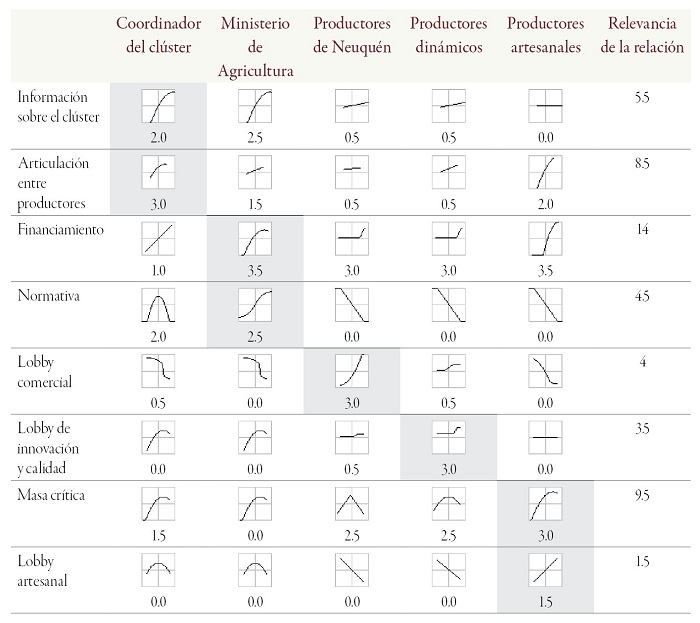 Además, en este escenario representado por la columna 4, la satisfacción total de la organización es extremadamente baja: 3.5 puntos. Por ello, se concluye que estructuralmente es poco probable que los productores de Neuquén sean capaces de lograr sus objetivos en este juego social. Por el contrario, cuando se maximiza la satisfacción de los productores artesanales (columna 6), la satisfacción total del clúster se eleva a 154.7. Así, se infiere que la estructura social del clúster beneficia más a los productores artesanales que a los neuquinos; por lo tanto, es más probable que los primeros logren sus objetivos.
