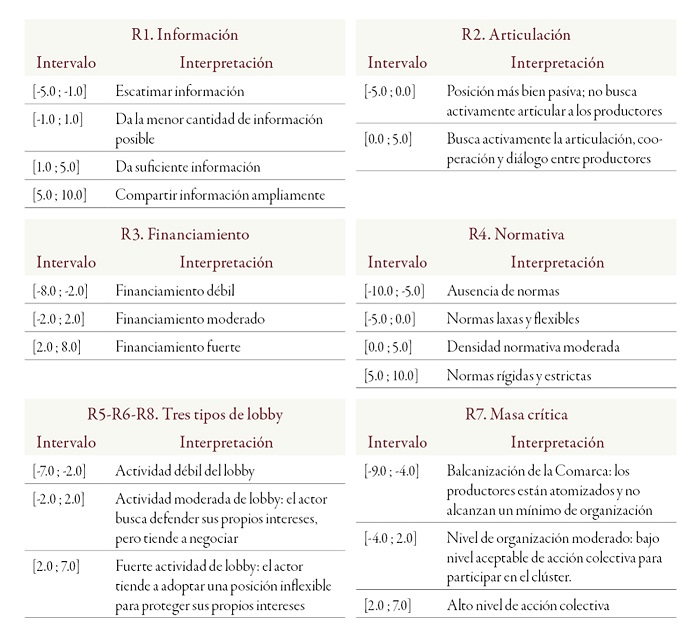 Es fundamental comprender que un modelo computacional es un modelo numérico; por lo tanto, la salida de una simulación es siempre un conjunto de valores numéricos. El modelador tiene la responsabilidad teórica de dar un significado conceptual a esos números y hacer que la simulación sea interpretable. Para ello, es muy importante conceptualizar el significado de los valores numéricos que representan los estados de las relaciones, es decir, el comportamiento posible de los actores. En el cuadro 2 se resume el espacio conductual de cada relación agrupada por intervalos de clase con su correspondiente interpretación teórica.