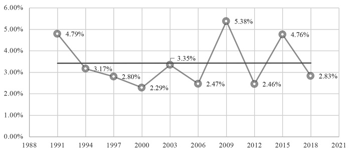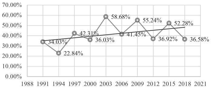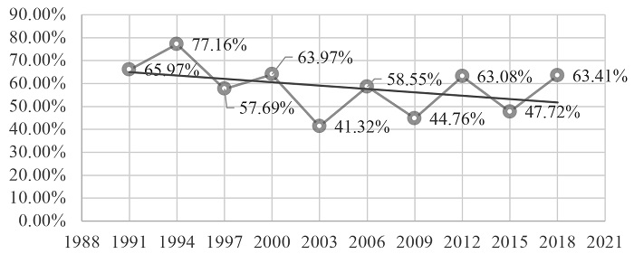 No obstante, en ocasiones se ha argumentado que el alto presupuesto público de los partidos políticos mexicanos está orientado al fomento de la participación democrática. Tal orientación es falsa, ya que, como se observa en la gráfica 3, de 1994 a 2018 el financiamiento público a partidos políticos aumentó 120.16 por ciento y la participación ciudadana disminuyó 14 por ciento, como se muestra en la gráfica 4.