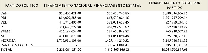 Las sumas que los partidos reciben cada año están definidas en la Ley General de Instituciones y Procedimientos Electorales (LEGIPE). Estas son distribuidas y confirmadas a través de acuerdos promovidos por el INE para el caso de los partidos políticos con registro nacional y por los institutos electorales locales para el caso de los partidos con registro estatal. Se asigna un 30 por ciento del presupuesto a todos los partidos políticos por igual y el restante 70 por ciento se distribuye según la fuerza electoral de cada partido.