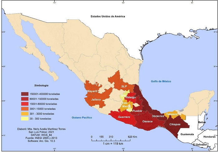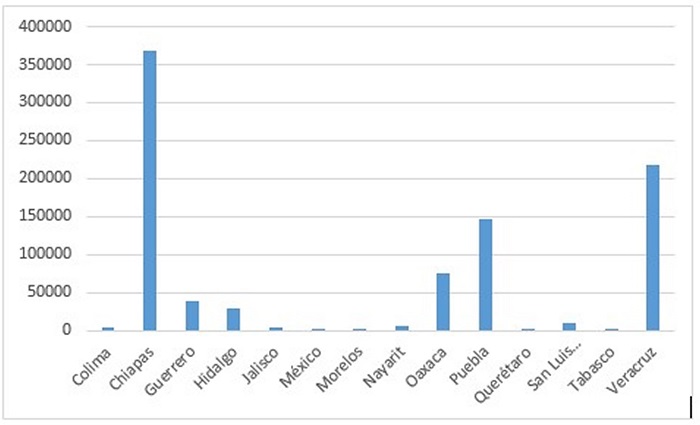 En el país, con base en el SIAP (2019), los principales estados productores, en volumen, son Chiapas, con 367 874 toneladas; Veracruz, con 217 633 toneladas; Puebla, con 145 979 toneladas, y Oaxaca, con 75 829 toneladas (véase la gráfica 1).