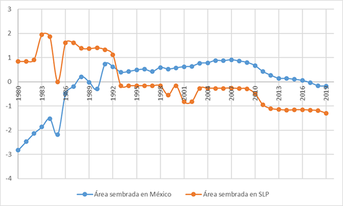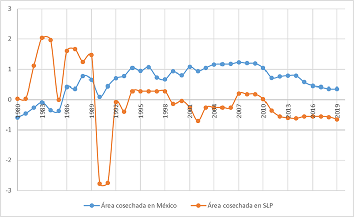 En cuanto a los datos reales, el área cosechada en México en 1989 fue de 678 075 hectáreas y en 2019 fue de 629 300 hectáreas; se nota una disminución de ocho por ciento del área cosechada. Para San Luis Potosí, el área cosechada en 1989 fue de 32 356 hectáreas y en 2019 fue de 16 196 hectáreas, es decir, disminuyó en más del 50 por ciento.