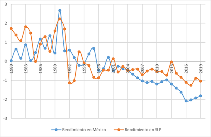 Según la gráfica 4, en 1989 hubo un incremento tanto en México como en San Luis Potosí, y un descenso abrupto en 1991, que es más evidente en el estado potosino. De 1991 a 2003 se registraron altibajos en el rendimiento, que en el caso de San Luis Potosí se mantuvieron hasta 2012, con un incremento significativo en 2013 y una tendencia a disminuir posteriormente.