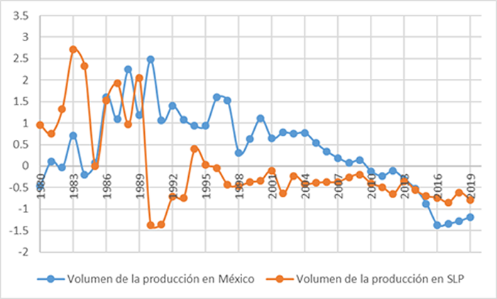 Para San Luis Potosí, de 1988 a 1989 hubo un ligero aumento, que contrasta con el dato de 1989, año en el que ocurrió un decremento abismal, del que poco a poco se fue recuperando hasta 1994. Posteriormente, el volumen de la producción volvería a caer poco a poco hasta 1997. Después se iría recuperando hasta el año 2001. De 2001 a 2002 hubo una baja del volumen de producción, de la que se recuperaría en 2003. De 2004 a 2011, el comportamiento fue similar, con una baja en 2012 y una recuperación en 2013. Luego continuó bajando hasta 2017; se recuperó en 2018 y descendió en 2019.
