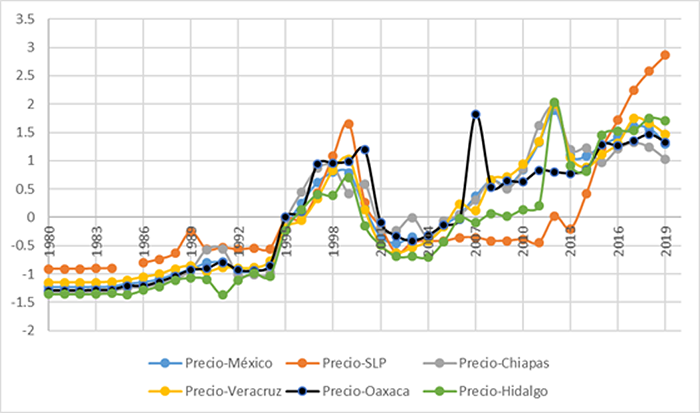 A partir de 2007 es evidente una variación desigual en el comportamiento del precio. En el caso de Oaxaca, en 2007 tuvo un aumento significativo e Hidalgo y San Luis Potosí mantuvieron un comportamiento de precio bajo con respecto de los demás estados.
