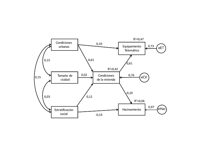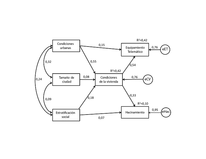 Como se constata en la figura 2, el mayor efecto directo de las variables exógenas sobre la variable mediadora se ubica en condiciones urbanas (pCU = 0.61), seguidas por estratificación social (pES = 0.12) y tamaño de ciudad, la cual deja de ser significativa (pTC = 0.02; p = 0.102). Las condiciones urbanas tienen un peso bajo sobre el equipamiento telemático (pCU = 0.10), mientras condiciones de la vivienda aumentó su influencia (pCU = 0.61). Las mejores condiciones de la vivienda también predicen una disminución significativa del hacinamiento (pCV = -0.20). El aumento del nivel socioeconómico por ingreso determina disminuciones del hacinamiento. Tanto las condiciones de la vivienda como el equipamiento telemático explican de manera notable las varianzas 42 y 47 por ciento, respectivamente, en tanto el hacinamiento solo explica el seis por ciento. Los errores asociados a las variables endógenas son elevados.