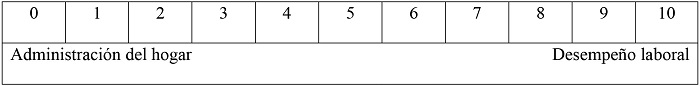 Se usó una escala del 0 al 10, en la que 0 corresponde a una inclinación hacia lo privado-reproductivo y 10 a una identificación con lo público-productivo. Se le pidió al entrevistado ubicar sus preferencias entre estos dos extremos dentro de un rectángulo. La indiferencia estaría marcada por el número 5, a la mitad de la recta. En la figura 1 se muestra un ejemplo.