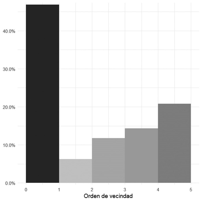 La segunda categoría busca definir la migración a partir de la vecindad. El criterio de vecindad, en este estudio, consiste en que los estados compartan fronteras; este corresponde a un criterio “torre” (Siabato y Guzmán-Manrique, 2019, p. 8). Para los originarios del estado de Coahuila, se tiene una vecindad de orden 0; los estados colindantes con Coahuila, como es el caso de Nuevo León, tienen un orden 1; los estados que colindan con los de orden 1 tienen un orden 2 de vecindad, y así sucesivamente. Se identificó hasta un orden 5, concentrados hacia el sur de la República Mexicana. Algunos estados con el orden 3 se ubican al norte; pero, en general, conforme se incrementa el nivel se van moviendo al sur. Esta forma de medir la vecindad es parecida a la utilizada en los modelos de gravedad que buscan determinar las causas de migración interna (Morales Ochoa et al., 2018) y que permiten reflejar la estructura espacial.