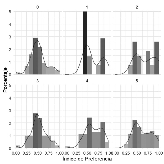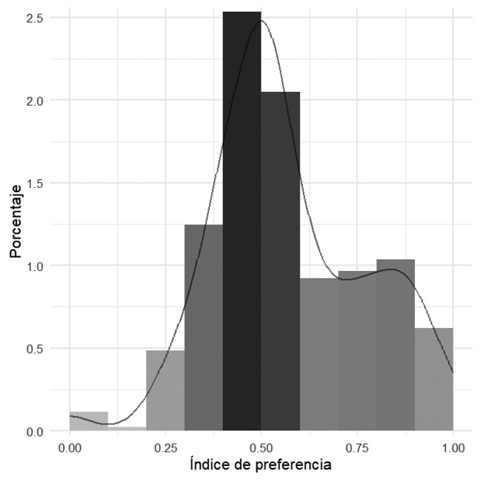 En cuanto al índice de preferencias de lo público-productivo, la figura 3 muestra una concentración en la indiferencia entre lo público-productivo y lo privado-reproductivo. Sin embargo, en esta figura, el montículo señalaría una preferencia por lo público-productivo. Dentro de los roles tradicionales cabría esperar dos montículos, uno cargado hacia el 0 y otro hacia el 1, de forma que lo representado podría informar de una búsqueda del equilibrio entre las actividades privado-reproductivas y las público-productivas, con un grupo de preferencias que se explicaría por el género, lo que correspondería a un rol tradicional del hombre.