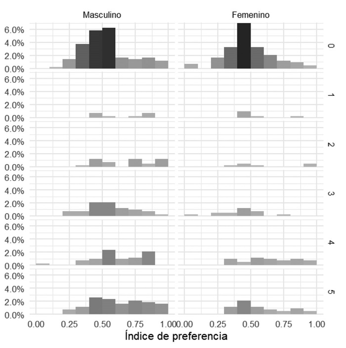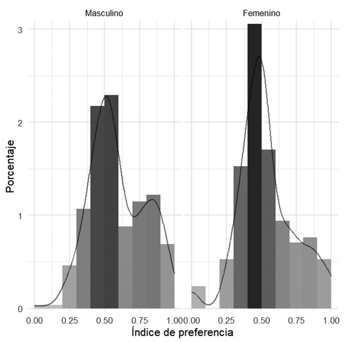 En la distribución del índice de preferencias según género se observan patrones distintos, pero que contienen algunos elementos semejantes, como se constata en la figura 4. En ambos géneros hay un comportamiento parecido al de la población total, pero con un mayor realce en lo que podría esperarse del rol tradicional en el lado masculino y una búsqueda de mayor equilibrio en la parte femenina. No obstante, en ambos casos, hay una mayor preferencia por lo público-productivo. Un punto importante que considerar es que en el género femenino es visible una mayor preferencia o una total preferencia por lo privado-reproductivo. Lo anterior nos señalaría que hay grupos de la población femenina que aún asumirían como válidos los roles tradicionales de género.