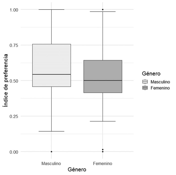 Dentro de un modelo tradicional se podría esperar que los hombres obtuvieran valores en el índice de preferencias de lo público-privado de entre 0.5 y 1, muy cercanos a la unidad, y las mujeres de entre 0 y 0.5, cercanos a cero. Para ambos géneros, los valores encontrados cercanos a 0.5 hablan de un equilibrio entre lo público-productivo y lo privado-reproductivo.