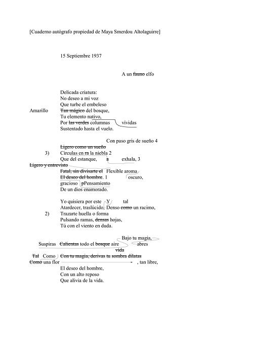 El trabajo de escritura y reescritura que es posible apreciar en los manuscritos puede parecer, al menos en una primera impresión, más interesante; se mezcla con los retos de la transcripción genética y con los de la edición; las borraduras, las sustituciones, las variantes de lectura o escritura, los desplazamientos del texto sin aviso previo, los reacomodos a través de números o líneas, la formación de paradigmas (o apilamientos, es decir, listados de palabras que expresan la dubitación de quien escribe ante distintas opciones léxicas), la deducción de campañas de escritura (u organización de los impulsos de escritura/borradura). Paradójicamente, el mayor esfuerzo no se pone en dinamizar el componente lingüístico, sino en estabilizarlo (¿fijarlo?) por medio de una transcripción genética que ilustre de forma comprensible el itinerario creativo del autor desde una perspectiva lógico-cronológica. En cierto sentido, toda transcripción genética traiciona su origen procesual al proponer un itinerario fijo en la transcripción. Pensemos, por ejemplo, en el manuscrito borrador autógrafo de “Scherzo para un elfo”, de Luis Cernuda, ultimado en un cuadernillo de su propiedad hacia el 15 de septiembre de 1937, en Valencia, y que hoy se conserva en el archivo personal de Maya Smerdou Altolaguirre, quien se ha encargado de la edición facsímil (Cernuda, 2002). Transcribo nada más las cuatro primeras estrofas: