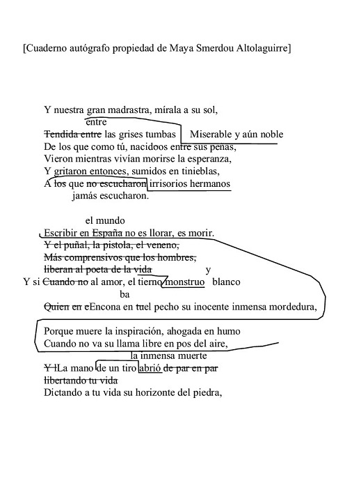 Algunas tachaduras expresan una dubitación reflexiva que no pudo zanjar por sí solo en este manuscrito de 1937; ante el verso “Escribir en España”, Cernuda suprimió “España” en el borrador preliminar bajo un tachado muy denso y lo sustituyó por “el mundo” en supralineado; en el borrador subsiguiente, nada más se interrumpe el verso (“Escribir en XXXX no es llorar, es morir”). Su indecisión de 1937 se resolvería cuando publica el poema en la edición mexicana de La realidad y el deseo de 1958. En el texto original, “Escribir en España no es llorar, es morir”, se denunciaba explícitamente el alcance de la censura en los medios para un Mariano José de Larra (con quien Cernuda se identificó); publicado en el exilio, no había razón para edulcorar su primera opinión. Lugares críticos como este no dejan lugar a dudas sobre la importancia de estudiar los manuscritos con una perspectiva publitextual, porque ahí pueden percibirse los verdaderos riesgos del autor. Antes de publicar su poema, dudó para sí; en el publitexto, tuvo que esperar la oportunidad de darlo a conocer en el exilio.