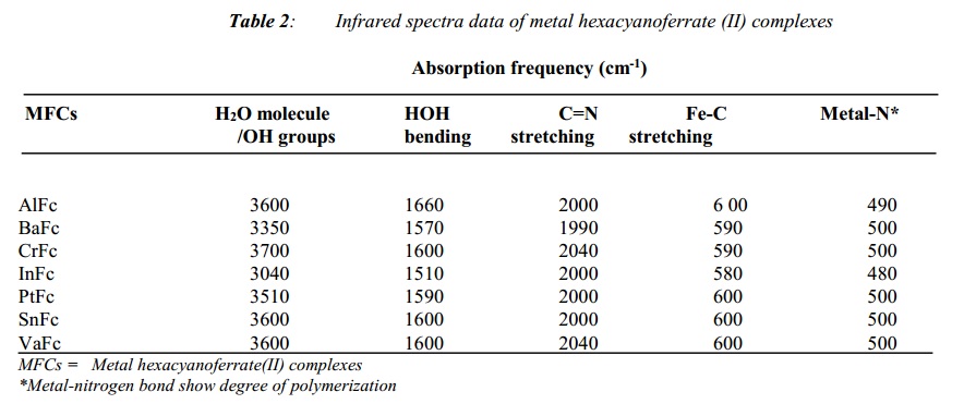 Another sharp band at 489-500 cm—1 in all seven metal hexacyanoferrate (II) complexes probably shows the presence of metal-nitrogen bond thus indicating a certain degree of polymerization in the products [21, 22] (Table 2).