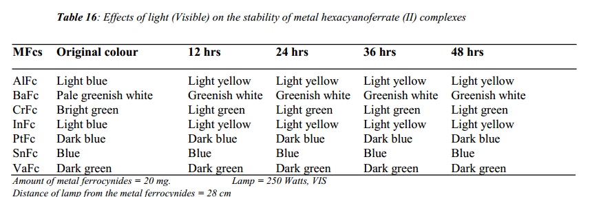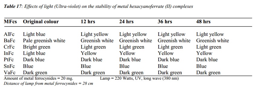 From Table 17 we see that complexes of hexacyanoferrate (II) of stannous, vanadium and platinum are stable to Ultraviolet light until 48 hours of irradiations. Also that those of aluminum, barium, chromium and indium are stable in ultraviolet light at 12 hours of irradiations.