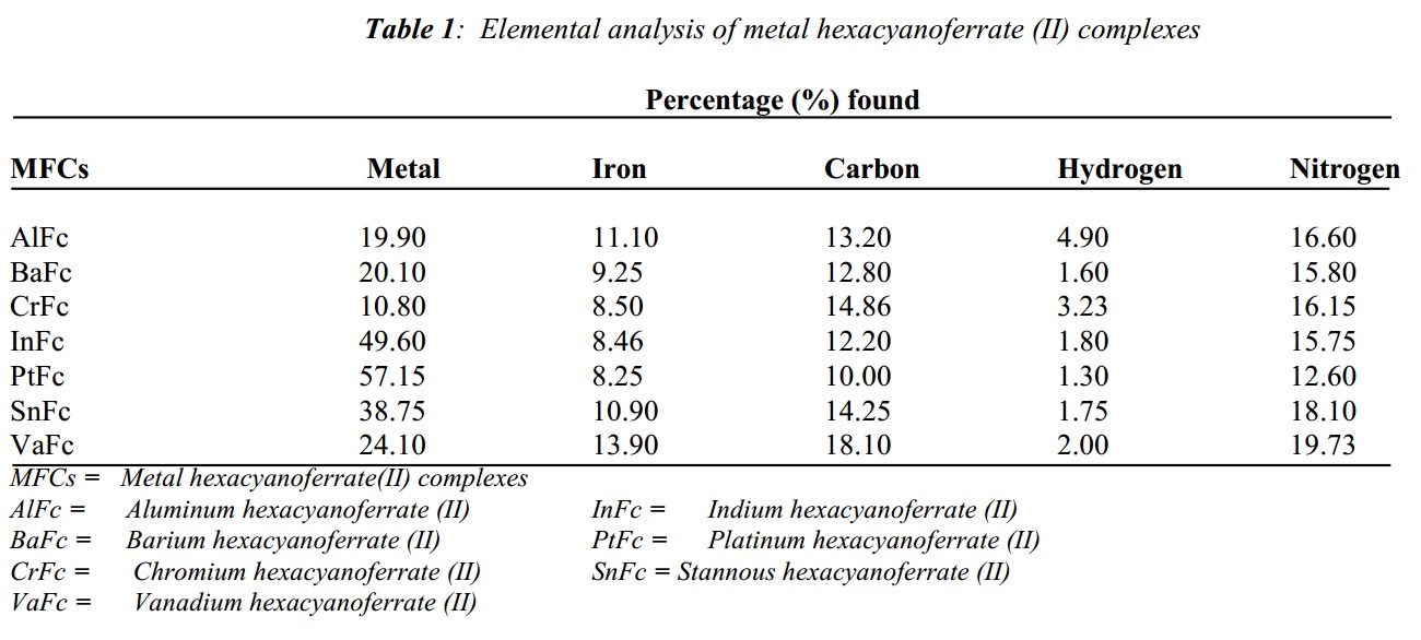 The percentage compositions of metals in metal hexacyanoferrate (II) complexes are given in Table 1. The percentage of metals (aluminum, barium, chromium, indium, platinum, stannous and vanadium) are found higher in comparison to iron in all complexes of hexacyanoferrate (II) studied. It is also clear from Table 1 that percentage of hydrogen is lowest in comparison to other elements in each metal ferrocyanides studied. The greater the percentage of hydrogen more the water molecules are expected to attached to metal hexacyanoferrate (II) complexes.