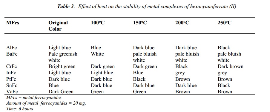 It is clear from Table 3 that hexacyanoferrate (II) complexes of indium and platinum are stable at 100oC, while those of aluminum, barium, stannous and chromium platinum are unstable at 100oC.