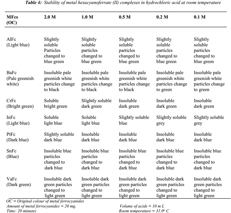 Table 5 shows that hexacyanoferrate (II) complexes of aluminum, stannous, vanadium and chromium are partially soluble in various concentrations of boiling hydrochloric acid with change in colour, while those of indium are soluble at various concentrations of boiling hydrochloric acid and those of barium and platinum are insoluble in various concentrations of boiling hydrochloric acid.