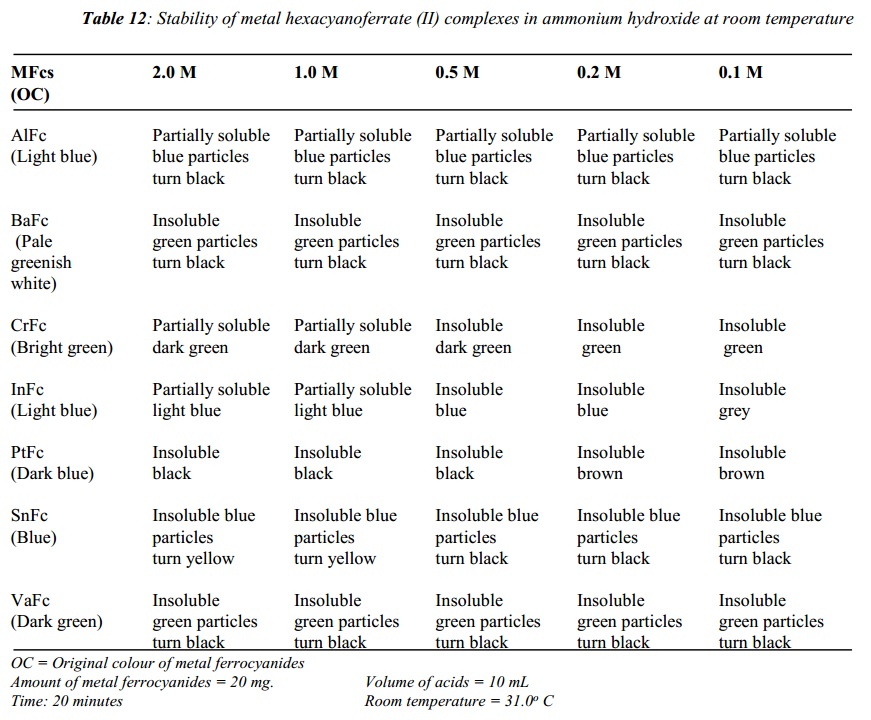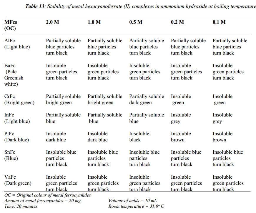 Table 13 shows that aluminum hexacyanoferrate (II) complexes are partially soluble in various concentrations of ammonium hydroxide with colour changes at boiling temperature, while those of chromium and indium are partially soluble at high concentration of ammonium hydroxide and insoluble at low concentration, respectively at when boiling, those of barium, stannous, vanadium and platinum are insoluble in various concentrations of ammonium hydroxide at boiling temperature.