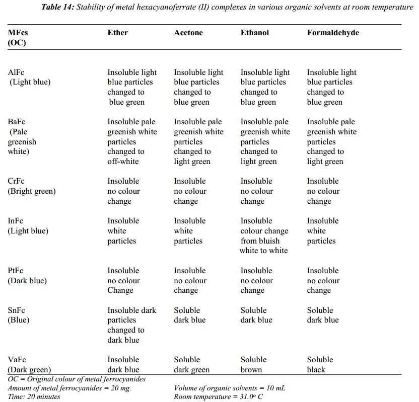 It is observed from Table 14 that complexes of aluminum hexacyanoferrate (II) and those of barium, chromium, indium and platinum are insoluble in various organic solvents; (ether, acetone, ethanol, and formaldehyde) at room temperature, those of stannous and vanadium are insoluble in ether, but they are soluble in acetone, ethanol and formaldehyde.