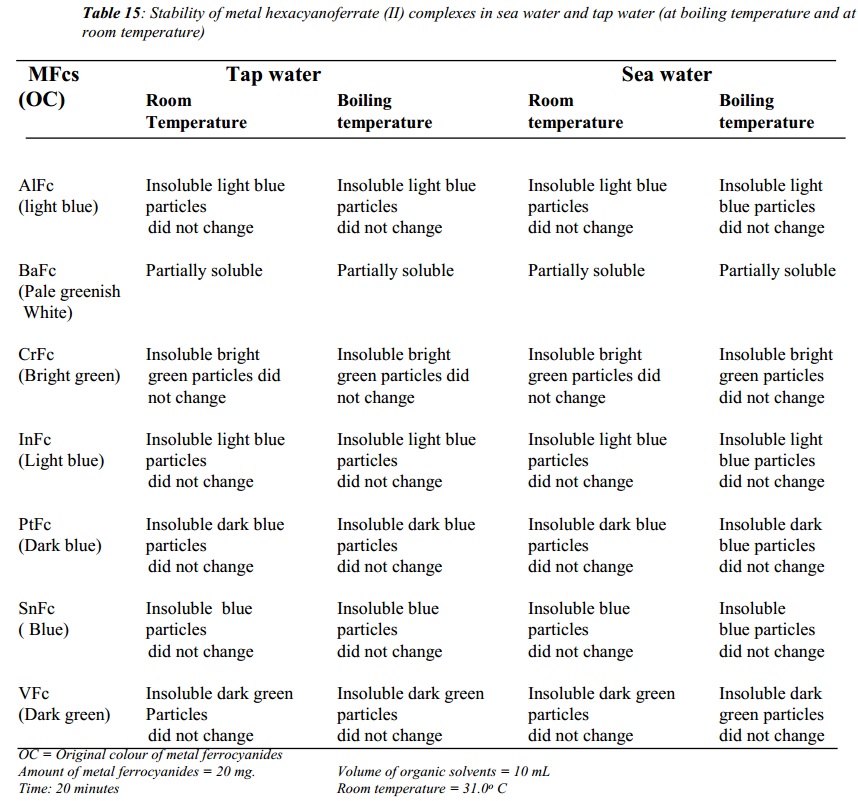 The metal hexacyanoferrate (II) complexes (20 mg) were placed in the test tubes containing tapwater and sea water. The mixture was agitated for 20 minutes and observation for any change in colour of metal hexacyanoferrate (II) complexes were recorded (Table 15). The same reaction mixture boiled on Bunsen flame for 20 minutes and any change in colour of metal hexacyanoferrate (II) complexes were recorded (Table 15).