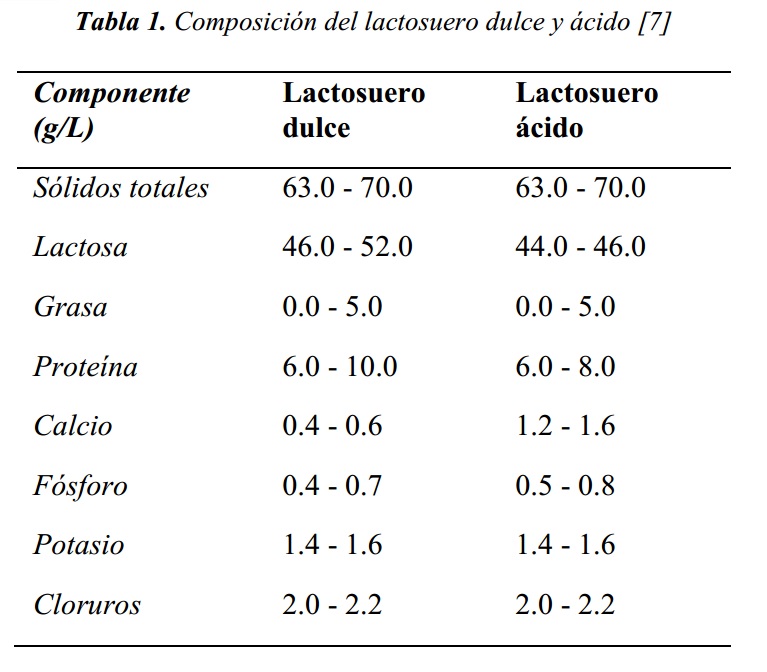 El lactosuero dulce se obtiene de la elaboración de quesos de pasta cocida y prensada (leche de vaca) y quesos de ovejas. Éste es pobre en ácido láctico, calcio y fósforo [28] y se obtiene mediante el uso de enzimas proteolíticas, las cuales actúan sobre las caseínas de la leche y las fragmentan, haciendo que se desestabilicen y precipiten. Por otra parte, el lactosuero ácido se obtiene mediante la precipitación ácida de la caseína, que se logra disminuyendo el pH de la leche a 4.5 [7, 28].