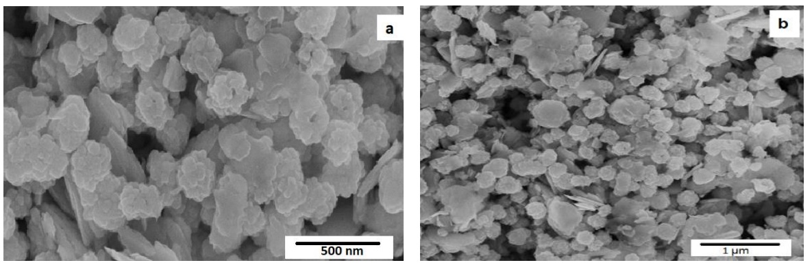 Micrografías SEM. SnS2-24H (a) Cristal (b) Aglomerado