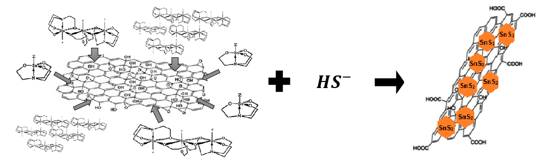 El semiconductor SnS2 presenta una banda de energía de ~2,2 eV activa en luz visible [4], por otro lado, las láminas de óxido de grafeno (GO) facilitan el flujo de electrones sobre la superficie de la misma [14]. Un material compuesto particulado, obtenido a partir de éstos, permite la sinergia de ambas propiedades mejorando la actividad fotocatalítica [14,16]. Actualmente, se busca métodos de síntesis que optimicen el control de la distribución, forma y tamaño de las fases presentes en el material compuesto.