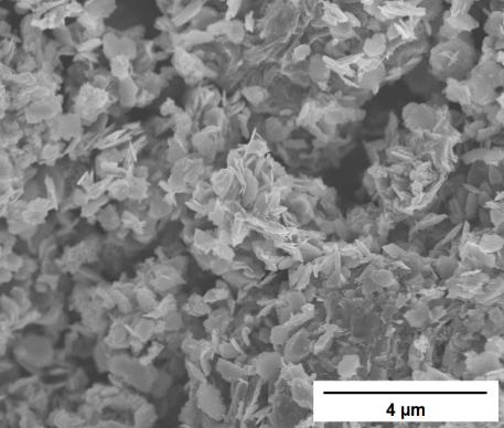 En la micrografía SEM (Figura N° 11) del material compuesto se observan partículas de SnS2 con un tamaño medio de 350 ± 30 nm, que forman aglomerados de un tamaño próximo a 4,0 ± 1,0 µm. El material compuesto presenta un tamaño del orden de 12,0 ± 4,0 µm, en consistencia con el tamaño de partícula del óxido de grafeno inicial (9 ± 3 µm), y de acuerdo al modelo propuesto. Se observa que las partículas de SnS2 se han formado y crecido en la superficie de las láminas de óxido de grafeno, recubriéndolo de manera homogénea, y es, debido a esto, el incremento de tamaño medio de partícula en el material compuesto.
