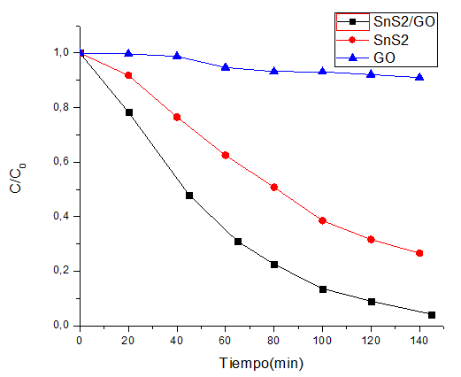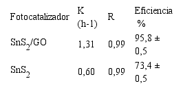 Para evaluar la cinética de reacción fotocatalítica se aplicó un modelo de primer orden (ecuación A), usado para procesos de degradación cuando el contaminante se encuentra en baja concentración. Los valores de las constantes globales de velocidad calculadas (Tabla Nº 1), muestran que la capacidad de degradación de los materiales obtenidos presentan el orden SnS2/GO > SnS2 > GO.