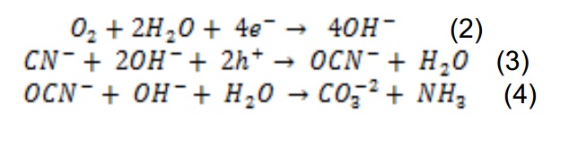 Las pruebas fotocatalíticas fueron desarrolladas en un reactor tipo batch bajo las siguientes condiciones de operación: agitación constante a 100 rev/min, temperatura promedio de 20°C, pH de la solución de CN- de partida de 11, radiación de luz solar con una energía media de (5000 W/m2). La concentración de cianuro fue medida con un electrodo selectivo de cianuro HI 4109, (HANNA) y el pH con un equipo pHmetro (OAKTON).