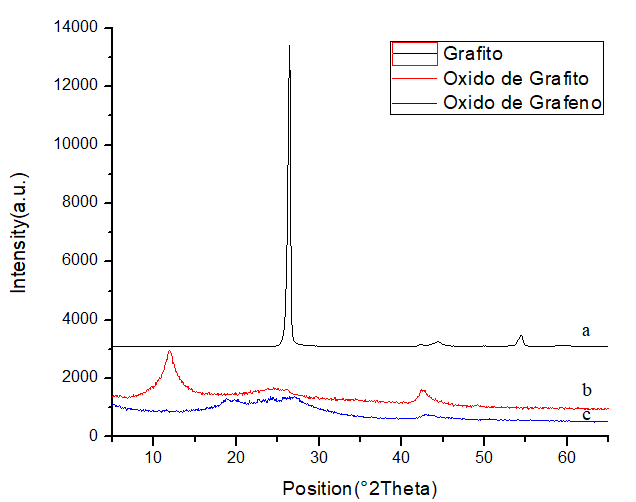 Espectros de difracción de rayos X. a) grafito puro. b) oxido de grafito. c) oxido de grafeno