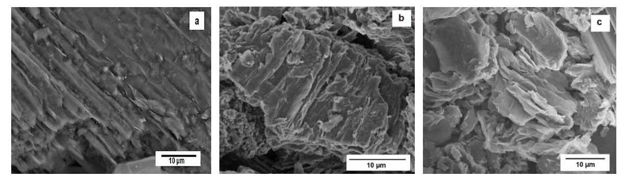 Micrografías SEM. (a) Grafito, (b) Oxido de grafito, y (c) oxido de grafeno