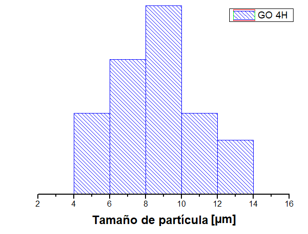 En este último caso, según el histograma de distribución de tamaño de partícula (Figura N°4), se obtiene un tamaño medio de partícula del orden de 9 ± 3 µm. Estos resultados son consistentes con el esquema del proceso de obtención de óxido de grafeno y con los espectros de DRX, donde se observó el desplazamiento del pico a ángulos más bajos en el proceso de oxidación del grafito, y por el tratamiento de exfoliación la desaparición de esta señal con la promoción de la banda ancha característica.