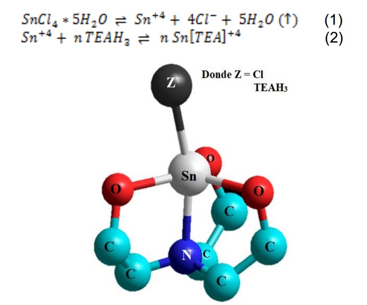 El precursor estannatrano (SnTEA), se forma a partir de la disolución de una sal de estaño (SnCl4 *5H2O) en trietanolamina (TEAH3) caliente (T=140 ºC), donde se forman los cationes de Sn+4 al mismo tiempo que se vaporiza el H2O (Reacción 1). En estas condiciones y con agitación constante se forma el complejo estannatrano (SnTEA) (Reacción 2) (Solución 1) [2,9,10,12]. El complejo estannatrano formado presenta al Sn+4 coordinado con tres átomos de O de los grupos etanólicos del TEA, un enlace coordinado con el par solitario del átomo de N, y en su posición apical a un átomo Z (donde Z = Cl, TEAH3) (Figura Nº 5) [11]. La estructura quelante del complejo estannatrano promociona su estabilidad en solución acuosa [9].