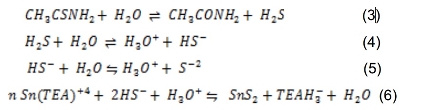 El azufre proviene de la disolución de la tioacetamida en medio acuoso (solución 2). La mezcla de las soluciones 1 y 2 es tratada hidrotermalmente, en este proceso se produce la hidrólisis ácida de la tioacetamida, (reacción 3) que conduce a la formación de los iones HS y S2 (reacción 4 y 5), los cuales reaccionan con los complejos estannatrano [10] produciendo la ruptura del complejo, promocionándose la formación de núcleos cristalinos de SnS2 (reacción 6) [1, 2, 13].