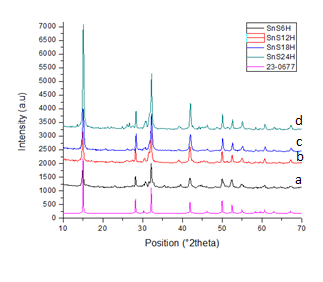 La Figura N° 6 muestra los espectros de difracción de rayos X de los materiales obtenidos por el método hidrotermal/atrano en función del tiempo (6, 12, 18 y 24 horas). En todos los casos se identifican señales de la fase hexagonal del SnS2 (23-0677 CAF, a: 3,65 Å; b: 3,65 Å; c: 5,90Å), y no se identifican señales adicionales de otras fases, lo cual indica que los productos obtenidos tienen alta pureza. Para un tiempo de reacción de 6 horas en el espectro de DRX (Figura N° 6a) se puede observar picos anchos y de poca intensidad con microdominio cristalino del orden de 237 ± 5Å, con el incremento del tiempo de hasta 24 horas (Figura N° 6d) se observan señales más intensas y agudas en el espectro de DRX con un incremento de los microdominios cristalinos hasta llegar al orden de 321 ± 5 Å.