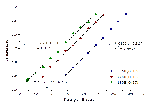 En los tres casos se observa el crecimiento de las partículas con un comportamiento lineal a través de procesos de condensación y/o agregación de los TOHAC. Las tres rectas presentan pendientes similares de la variación en la absorción espectroscópica de UV-Vis, ésto, permite sugerir un crecimiento medio de las partículas en el tiempo equivalente para las tres proporciones molares (H2O/Titanatrano = 139, 278, 556). En todos los casos, se concluye que las partículas aumentan de diámetro regularmente con el tiempo, desde un tamaño crítico de las TOHAC hasta cierto valor máximo de nanopartículas, micropartículas, o gel. Este comportamiento, permite establecer la capacidad de controlar el grado de crecimiento (tamaño de partícula) como función del tiempo y de la relación molar (h) utilizada, por lo que se puede obtener partículas con tamaños desde nanométricos, hasta micrométricos, o geles.