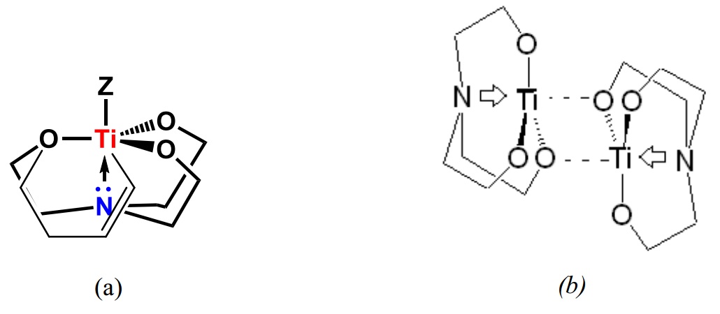 La utilización del complejante tipo quelante, trietanolamina (Tris (2-hidroxietil) amina, 2,2',2" (TEAH3)) conduce a la formación de complejos denominados tipo metalatranos [19 - 20]. En general, éstos presentan estructuras tricíclicas pentacoordinadas (N(CH2CH2O)3 M – Z), donde M es un metal (M = Si, Al, Ti, Zr, otros) y Z es un sustituyente en la posición apical (Z= trietanolamina, alcoxi OR, OH, CH3, entre otros) [21 – 25]. Los complejos atranos han demostrado concretizar un mayor control de las velocidades de reacción de hidrólisis y condensación, por lo que la trietanolamina es considerado como un agente retardador de la hidrólisis [26 - 30]. Varios complejos tipo atrano con titanio han sido reportados demostrando la formación de especies monómeras, dímeros, tetrámeros, e incluso en algún caso hexámeros [31 - 37].