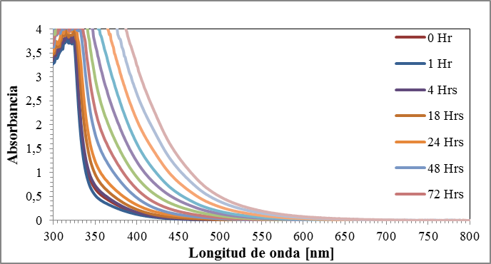 Cambios en los espectros de absorbancia UV – Vis, durante la formación de clústers de oxo – hidróxido - atrano de titanio (relación molar 556H2O/ 1Titanatrano, temperatura de 70°C, medidos en función del tiempo de reacción - horas)